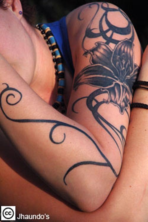 Some folks favour a wider mixture of color for their flower tattoo and vine designs for women. For this you could use large clumps of fiery red Virginia creeper over a broad area of the body; soft sprouts of purple, red, and pink and white sweet pea; or a creeping kudzu with its royal blue, or dark purple, and tail-like blossoms. given the vast array usable, your flower tattoo and vine designs for women can be an burst of colors, and feature any combination of these plants; they can be done in stripes down the back, they can be mingled together, or located in their own private part of the body.